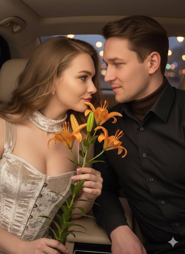 Сохрани внешность 1:1. Ультрареалистичная фотография 8К. максималый фотореализм, сверхдетализация, высокая резкость, профессиональная фотосъемка, крупный план пары, находящейся в замкнутом пространстве салона автомобиля, женщина изображена в профиль слева, держит в руках ветку с крупными раскрытыми бутонами тигровой лилии с листьями и подносит бутон к лицу словно вдыхая аромат, ее мужчина расположен справа и слегка наклонен, он смотрит на нее пронзительным взглядом с заботой. В меру накаченный мужчина в темной рубашке, молодая женщина одета в светлый корсет с горлом из бархата и видимыми косточками. Съемка с близкого расстояния, высокая детализация одежды. За окном машины вечерний город Москва. Теплый свет освещает машину и легкое боке за пределами машины. Волосы девушки уложены в салоне волнами