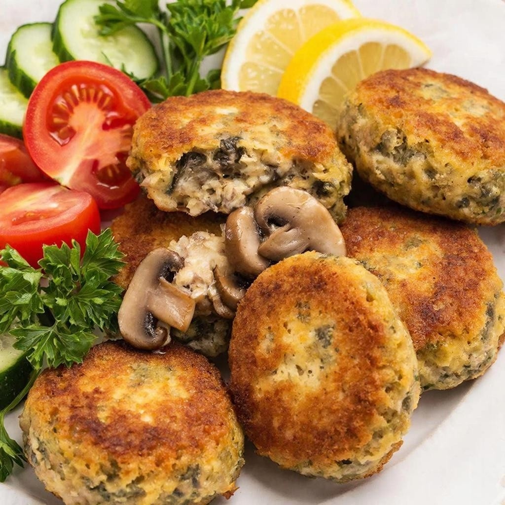 Растительное масло, обжарить лук и грибочки, затем котлетки.