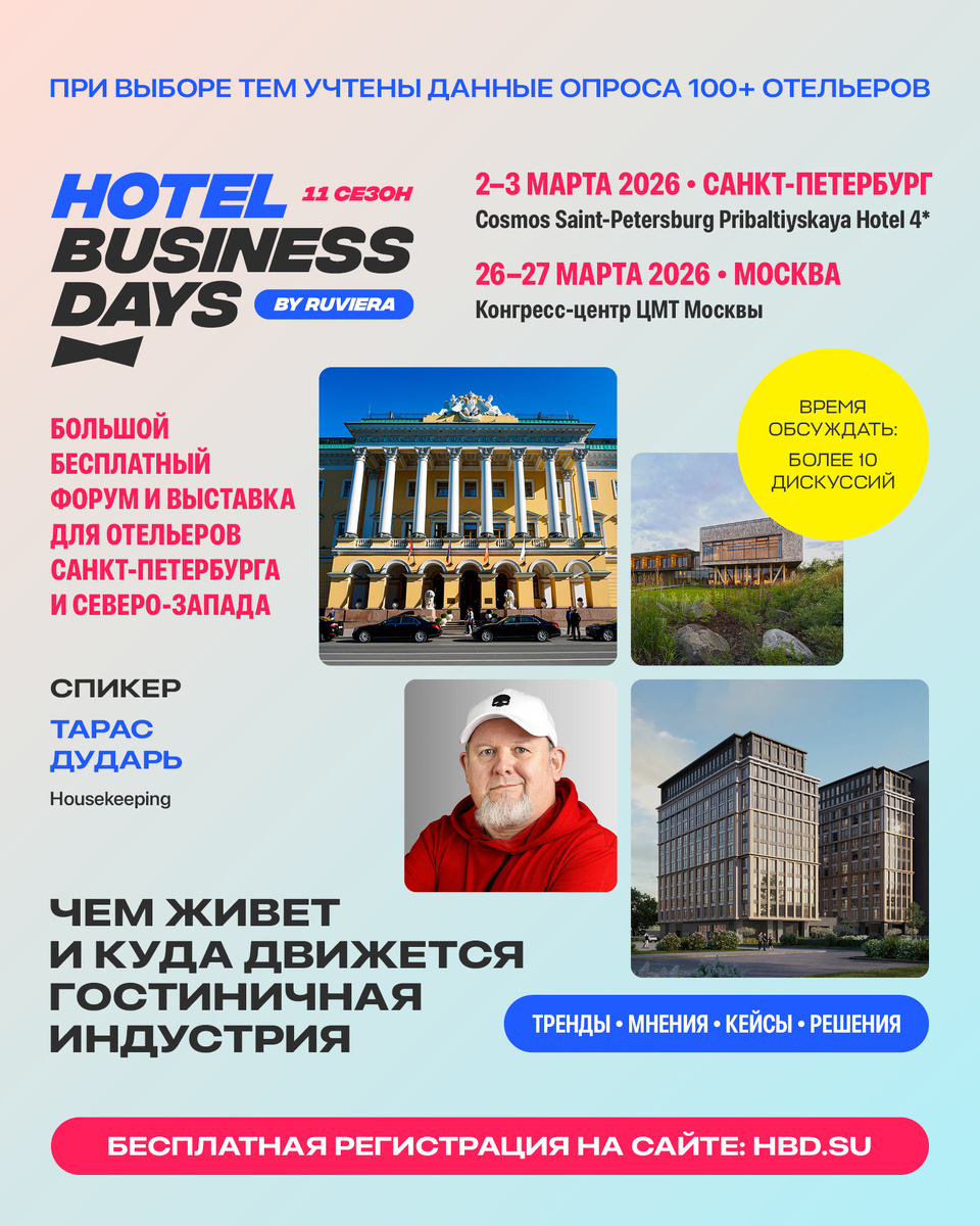 Ежегодно, в начале весны отельеры, эксперты и поставщики встречаются в Санкт-Петербурге и Москве на Hotel Business Days, чтобы обсудить и разобрать, чем сегодня живёт и куда движется гостиничная индустрия в России. А в текущей ситуации — много важных тем для обсуждения. Это большой форум и выставка ведущих поставщиков и партнеров отрасли. Собирается широкое отельное сообщество — качественно, полезно и бесплатно для отельеров. Приглашаю присоединиться! Я участвую как спикер в обоих городах. В 2026 году на форуме 12 тематических сессий, 4 зала и больше 80 спикеров. Программа разработана для всех ключевых позиций в отеле — от отдела продаж до хаускипинга. Есть несколько секций для руководителей и блок по гостиничному девелопменту. Можно прийти на оба дня, а можно и всего на полдня — на свою секцию. Выставка поставщиков как всегда интересная и представительная, можно закрыть много текущих вопросов и поискать предложения для оптимизации расходов. В этом году на выставке каждый день разыгры