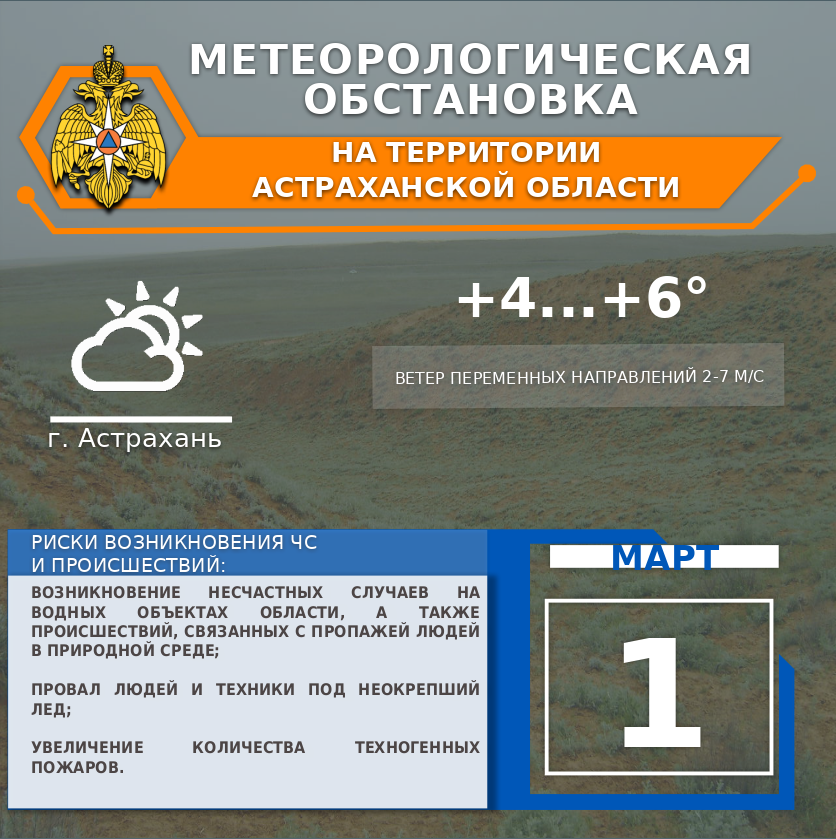 На территории области переменная облачность. Без существенных осадков. Ветер переменных направлений 2-7 м/с. Температура воздуха +1...+6°. По г. Астрахань переменная облачность. Без существенных осадков. Ветер переменных направлений 2-7 м/с. Температура воздуха +4...+6°.