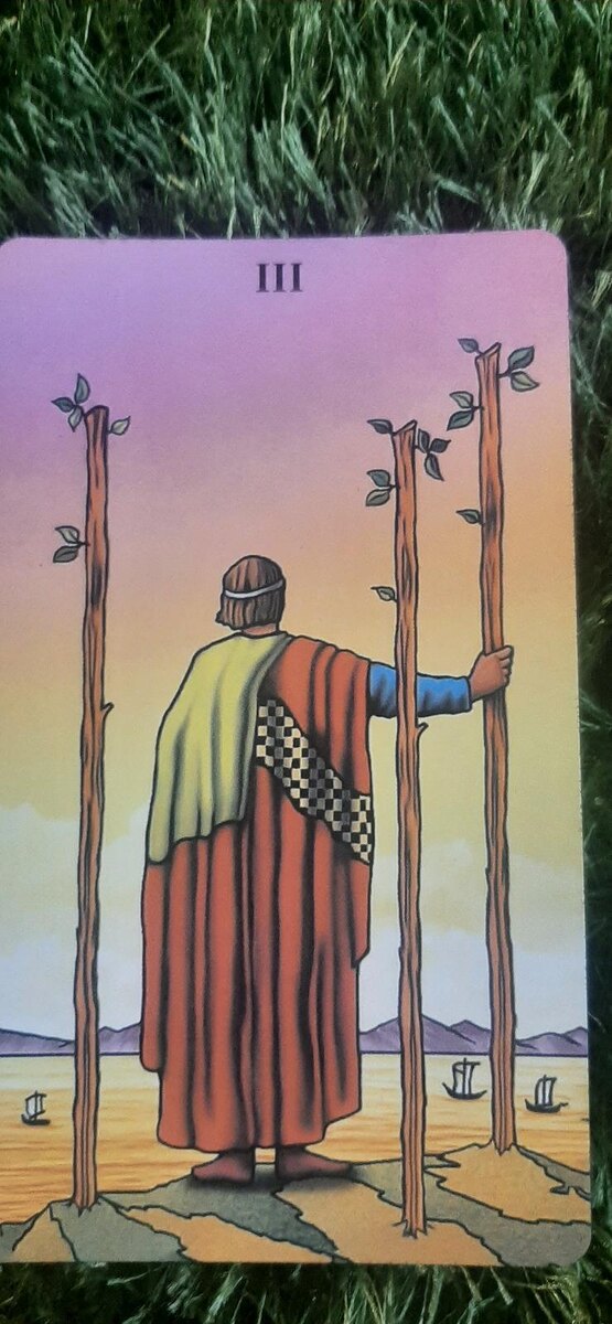 Тройка — первое число, рождающееся из взаимодействия единицы и двойки. Это результат союза, плод, ребёнок, синтез. В стихии Огня (Жезлы) тройка означает первый видимый результат действия. Если Туз Жезлов был искрой замысла, Двойка Жезлов — выбором направления и ресурсов, то Тройка Жезлов — это первый росток, пробивший землю. Это может быть первый позитивный отклик на ваше предложение, первый клиент, первая глава книги, первый километр пройденного пути. Но тройка — это ещё не урожай. Это обещание урожая. Росток ещё слаб, его легко затоптать, засушить, выдернуть. Он требует осторожности, внимания, но не насилия. Число 3 — это энергия распространения, расширения, движения вовне. Однако в Тройке Жезлов это расширение — не активное вторжение, а терпеливое ожидание, взгляд с высоты на горизонт.