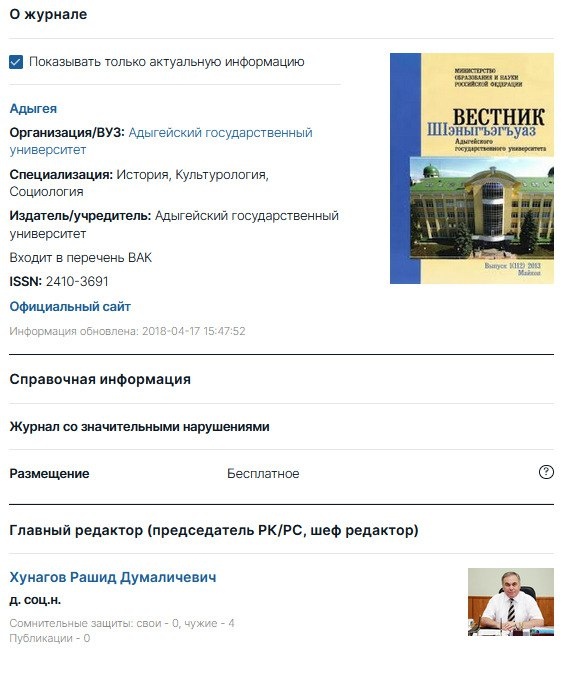 Российский исторический журнал Организация/ВУЗ: Адыгейский государственный университет Специализация: История, Культурология, Социология Издатель/учредитель: Адыгейский государственный университет Входит в перечень ВАК https://www.dissernet.org/magazine/vestnik_adygeyskogo_gosudarstvennogo_universiteta_seriya_regionovedeniye_filosofiya_istoriya_sotsiologiya_yurisprudentsiya_politologiya_kul_turologiya