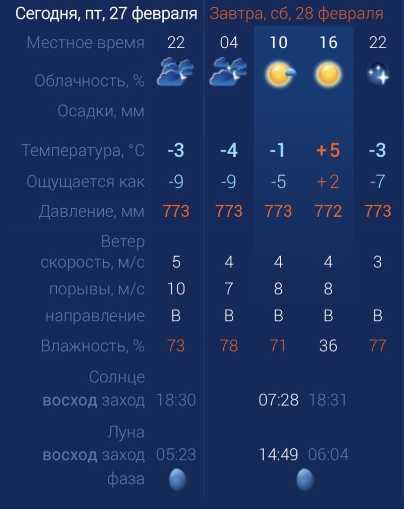В субботу в регионе будет достаточно приятная погода – без сильного ветра и осадков. Днем за окном ожидается солнце и плюсовая температура. Утром температура в городе составит ‑1 градус. Днем потеплеет до +5. К вечеру температура упадет до ‑3 градусов. Астраханцев ждет восточный ветер со скоростью 4–8 м/с. Атмосферное давление составит 772 мм рт. ст. Влажность воздуха выше нормы. На территории всего региона будет восточный ветер со скоростью 4–8 м/с. Температура воздуха ночью опустится до ‑1 градуса, а днем повысится до +5. Погодные приметы: Сообщение 28 февраля в Астраханской области будет солнечно появились сначала на Астрахань.Ру последние новости региона.