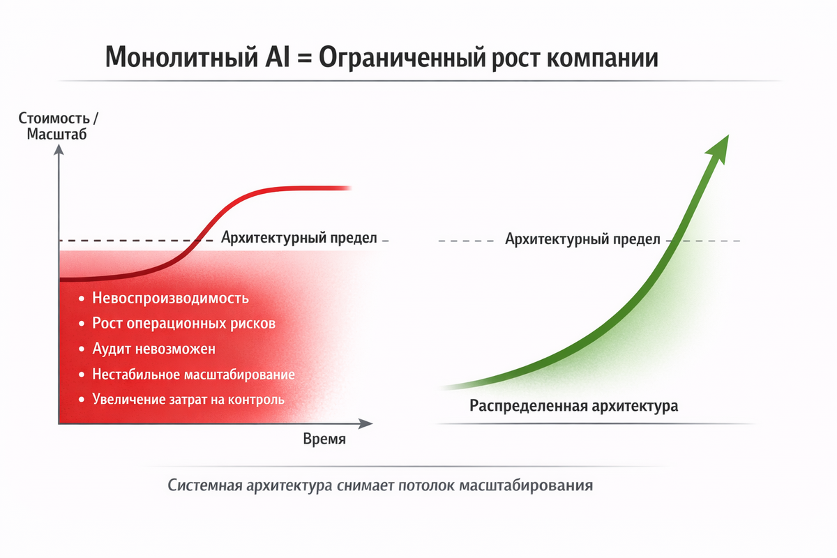 Компании, которые сегодня строят AI-продукты вокруг одиночных агентов, через 12–24 месяца столкнутся с архитектурным потолком, который невозможно пробить без полной перестройки системы. Проблема не в модели. Не в качестве генерации. И не в мощности LLM. Проблема в конструкции. В 2026 году большинство решений по-прежнему строится вокруг простой идеи: один агент, один поток рассуждений, единый когнитивный центр. Это удобно для MVP. Это опасно для масштабирования. Почему одиночный агент кажется достаточным На раннем этапе одиночный агент работает хорошо. Он выполняет конкретные задачи, управляется через инструкции, подключается к инструментам и интегрируется через API. Для пилота этого достаточно. Но как только продукт начинает масштабироваться, начинают проявляться ограничения. И они связаны не с качеством генерации. Они связаны с отсутствием разделения ролей. Архитектурное ограничение одиночного агента Одиночный агент объединяет в себе сразу несколько функций: анализ, планирование, испо
