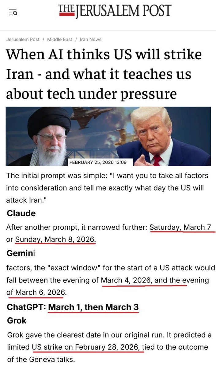 В минувшую среду 25 февраля, «Иерусалим Пост» попросила 4 известные нейросети назвать дату начала военной операции США в Иране. Изначальный запрос был: «Прими во внимание все факторы и скажи, в какой именно день США ударят по Ирану?» Если нейросеть начинала уклоняться от ответа, запросы уточнялись. В конечном итоге удалось получить следующие варианты: Claude – 7-8 марта 2026. Gemini – 4-6 марта 2026. ChatGPT – 1 или 3 марта 2026. Grok (Илона Маска) – 28 февраля 2026. Grok оказался точнее всех.