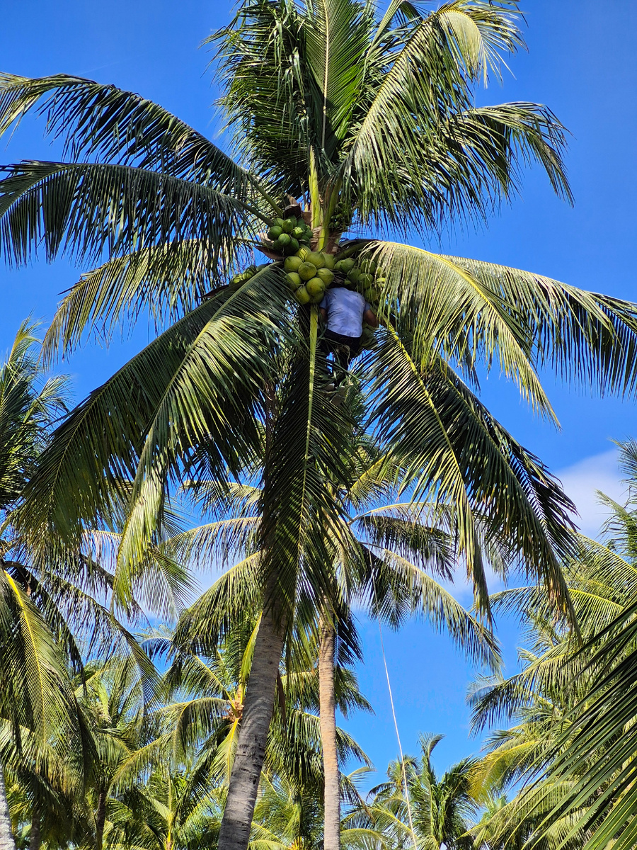В семь часов, кое-как собрав себя в горсть, поплелись, еле волоча ноги по берегу. У наклонной пальмы лодки, вытащенные на берег, с сетями.
