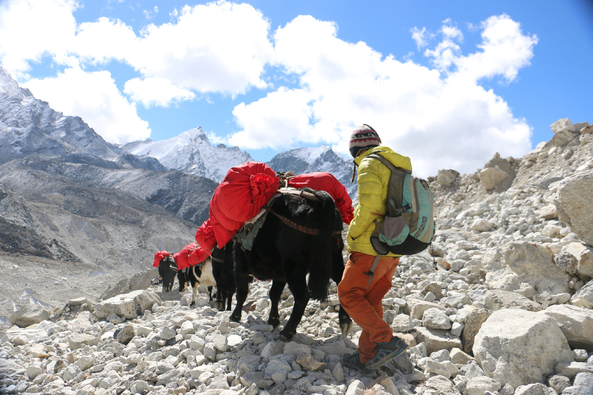 Одно из самых моих ярких впечатлений от первого посещения Непала — это караваны вьючных животных: осликов, мулов, лошадей и могучих яков. Сначала слышишь звон колокольчиков. Если звук тонкий и звонкий, то вслед за ним появляются бегущие ослики или мулы. Без груза они бегут легко и весело, а под грузом идут равномерно, чётко ставя копыта. Если же звук глухой, низкий, будто кто-то медленно ударяет в колокол — значит, идут яки. Они появляются неспешно, уверенно, тяжело ступая по камням. Услышав звук, необходимо прижаться к склону, нельзя стоять со стороны обрыва. Караван движется, не обращая внимания на препятствия на пути. Особенно яки. Они, как тяжёлые баржи, идут своим курсом, не сворачивая. Попытка увернуться, стоя на краю обрыва, может закончиться падением. Лучше остановиться заранее, убрать палки, не делать резких движений и спокойно дождаться, пока караван пройдёт. Иногда стоишь так, чувствуешь тёплое дыхание рядом, слышишь тяжёлый шаг — и понимаешь, кто на этой тропе хозяин. Больш