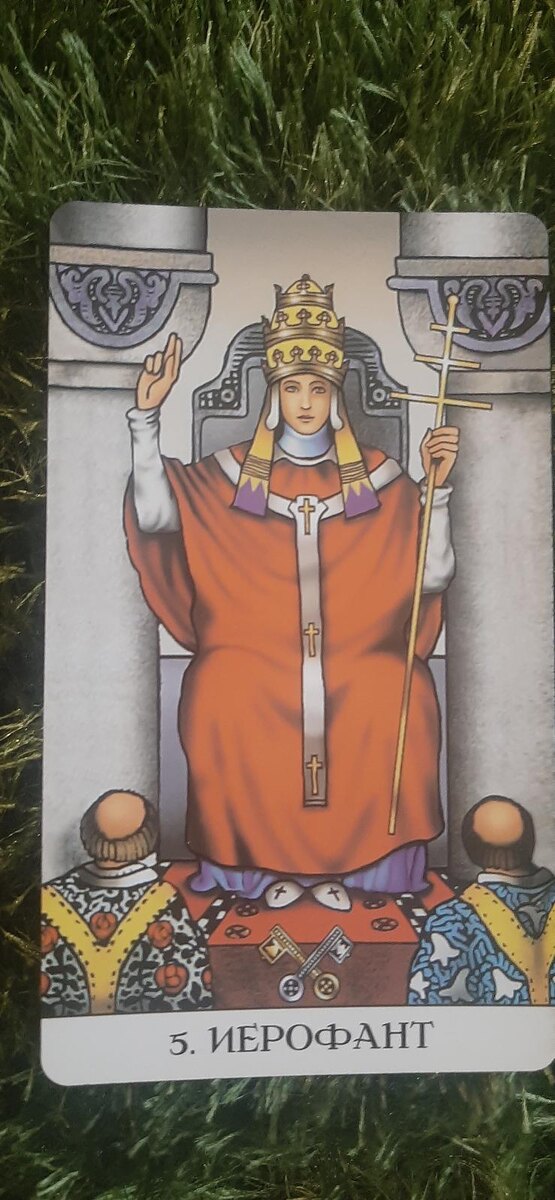 Иерофант восседает на троне между двух колонн — серой и чёрной (или золотой и серебряной). На его голове папская тиара, в левой руке тройной крест, правая поднята в жесте благословения. У его ног — два скрещённых ключа (к небу и к земле), а перед ним на коленях — два последователя. Это не жёсткая иерархия, а инициация: он передаёт ключи тем, кто готов их принять. Глубинный психологический смысл этого архетипа — в потребности принадлежать. Мы, современные люди, часто гордимся своей независимостью: «Я сам себе авторитет», «Я не хожу в церкви», «Я не состою в партиях». Но плата за такую свободу — экзистенциальное одиночество и необходимость каждое утро изобретать смысл жизни заново.