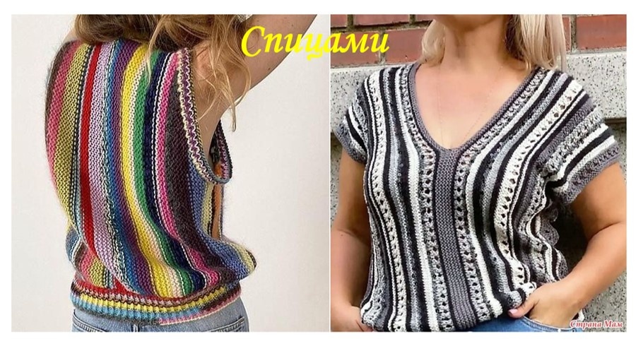 Решила к лету связать себе полосатый топ. В этой эстетической задаче кроется практическая: пристрой остатков хлопковой пряжи. Полоски придают одежде динамики, яркости. Они могут располагаться горизонтально и вертикально. Мне нравятся вертикальные полоски тем, что они зрительно вытягивают образ. Такие линии образуются при поперечном вязании изделия. А у меня ещё не было опыта создания подобной вещи ни крючком, ни спицами. Значит, нужно восполнить пробел. Сравнивая фотографии, подобранные поисковиком, пришла к выводу, что сотворённые и крючком, и спицами полоски эффектны. Техника исполнения не оказывает существенного влияния на вид изделия - здесь всё определяется предпочтением мастерицы. Вот модели, связанные спицами: А эти созданы крючком: Все топы, независимо от инструмента, красивы и функциональны. Контрастные полоски выглядят более выразительными, привлекают больше внимания, а гармонические сочетания - более нежно и сдержанно. Мне показалось, модели крючком более воздушны. Но это о