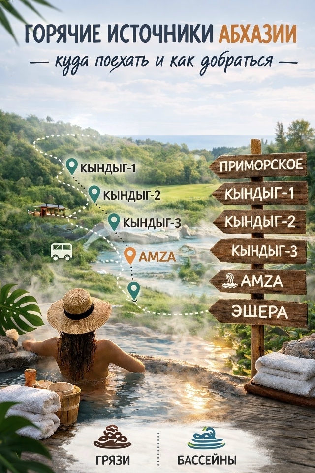 В Абхазии несколько сероводородных источников, и каждый из них отличается атмосферой, масштабом и уровнем инфраструктуры. Где-то всё просто и по-народному, где-то уже формат почти спа-комплекса. Собрали подробную информацию - чтобы вы понимали, куда именно едете. Находятся в Очамчирском районе, восточнее Сухума. В народе говорят просто “Кындыг”, но на карте есть три отдельных комплекса: