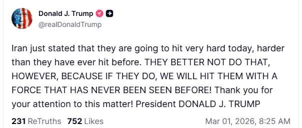 Президент США Дональд Трамп обратился к властям Ирана с призывом отказаться от планов по нанесению ударов возмездия. Заявление прозвучало на фоне сообщений Тегерана о подготовке мощной атаки, которую иранская сторона назвала «сильнейшей в истории». «Иран только что заявил, что сегодня они нанесут очень сильный удар, сильнее, чем когда-либо прежде. Лучше бы им этого не делать», — подчеркнул американский лидер. Сайт "Другая Украина" / Telegram / Вконтакте / Центр поддержки Украинцев "Другая Украина" теперь в МАХ