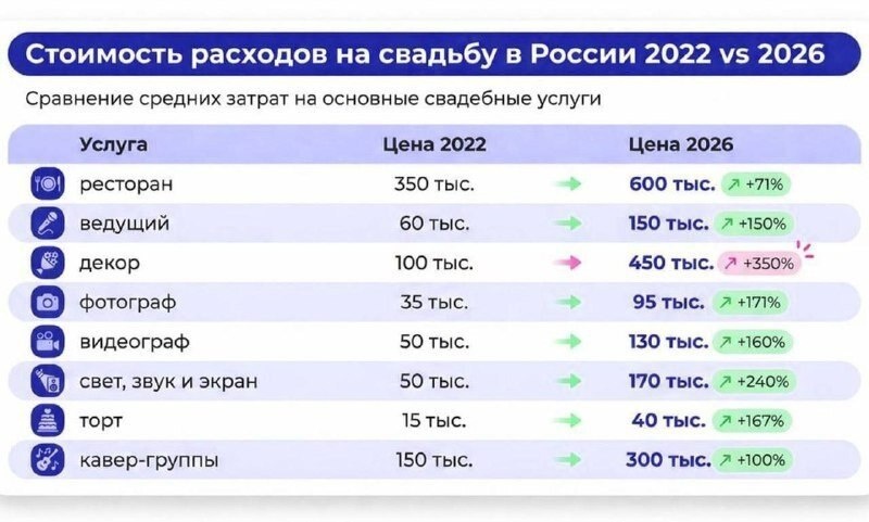 Средний бюджет вырос с 810 тыс. руб. в 2022 году до ~2 млн сейчас, особенно подорожал декор — до +350% за четыре года. Пары экономят: выбирают минималистичные площадки, оформляют сами или ограничиваются ужином вместо большого торжества.