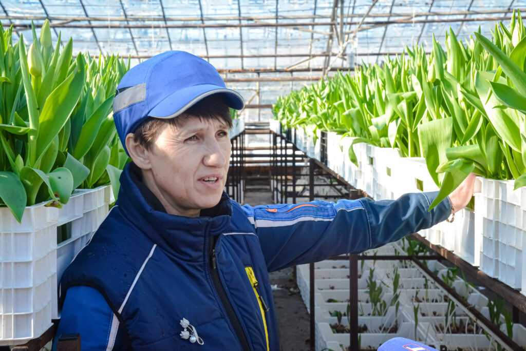 Главный агроном хозяйства Светлана Абдршина поясняет, что скорость развития растений регулируется с помощью температуры, вентиляции, проветривания. Готовые к сбору цветы работницы хозяйства складывают вместе с луковицами в кулечки и отравляют в холодильник дожидаться отгрузки покупателям. Светлана Петровна ведет нас между стеллажами, где в контейнерах питаются специальным раствором остатки урожая сорта Том Пус: