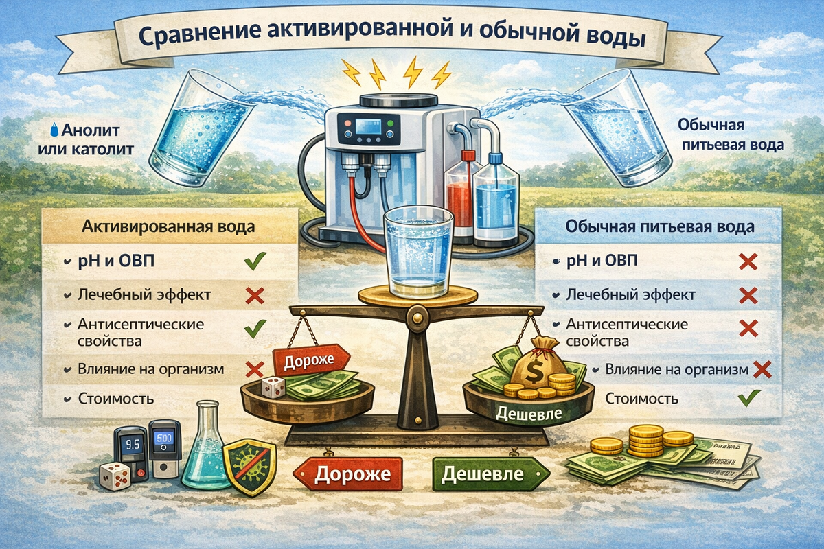 В последние годы растёт интерес к активированной воде — воде, прошедшей электрохимическую обработку (электролиз). Производители заявляют о её особых биологических свойствах, антиоксидантном потенциале и улучшенном усвоении организмом. Чтобы объективно оценить такие утверждения, необходимо сравнить активированную воду с обычной питьевой водой по основным физико-химическим и физиологическим параметрам. Обычная питьевая вода — вода, соответствующая санитарным нормам по микробиологическим и химическим показателям. Активированная вода — вода, подвергнутая электрохимической обработке с получением: ПараметрОбычная питьевая водаКатолитАнолитpH6,5–8,58,5–10,52,5–6,5 Вывод: