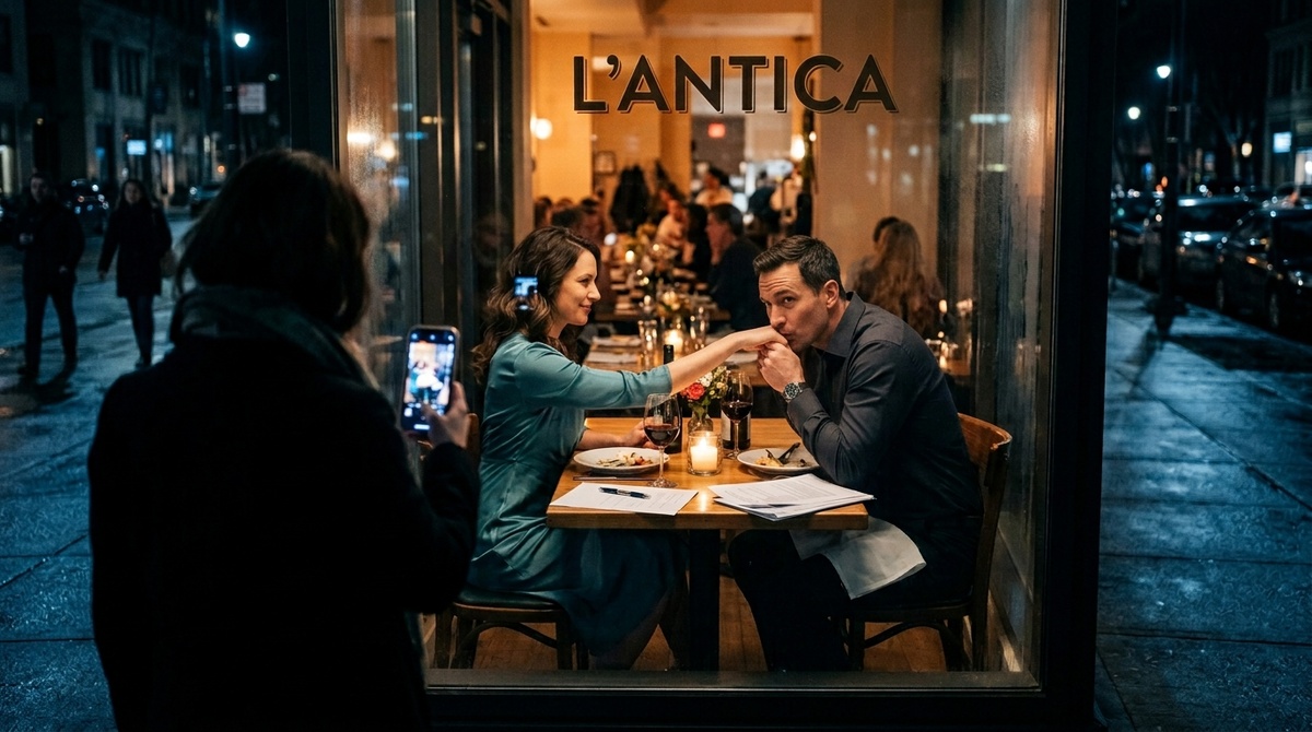 Мой муж. В рубашке, которую он надевает только по особым случаям. С бокалом красного вина. И — напротив него — молодая женщина в платье цвета морской волны, которая что-то говорила, наклонившись чуть вперёд.