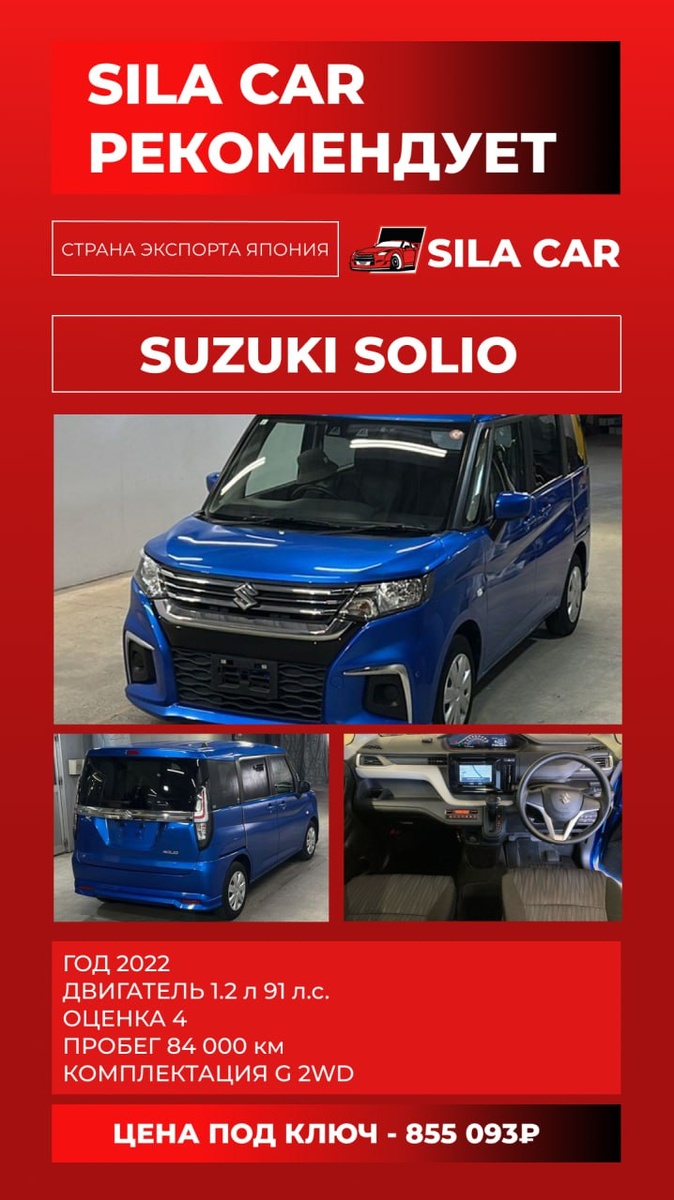 Автомобиль в наличии в Японии! ┏ Реально честная комиссия: ┣ 50 000₽ на авто до 1 млн ₽ ┣ От 1 до 2,5 млн. ₽ - 70.000₽ ┗ От 2,5 млн. ₽ - 100.000₽ ❗️SUZUKI SOLIO в продаже🚗 🚙SUZUKI SOLIO 📍Год: 2022 📍Двигатель: 1.2л / 91 л.с. 📍Пробег: 84 000 км 📍Комплектация: G 2WD ❤️🔥 ЦЕНА ПОД КЛЮЧ: 855.093 📍Для консультации и брони автомобиля пишите менеджеру Даниилу 📞 +7(908)979-36-95 🔵@SilaCarDAN 👉Для РАСЧЕТА СТОИМОСТИ АВТО жмите сюда💪 Или звоните: 88007002375 ❗️А для тех, кого интересует АВТОКРЕДИТ : +79147036533 💻Самостоятельный расчет на нашем сайте: silacar.ru ДОРОГО НАСЧИТАЛИ? Напиши нам📍БЕСПЛАТНО ПРОВЕРИМ РАСЧЕТ КОНКУРЕНТОВ НА СКРЫТУЮ КОМИССИЮ 👆🏼❗️ СИЛА КАР – СИЛА В ПРАВДЕ💪