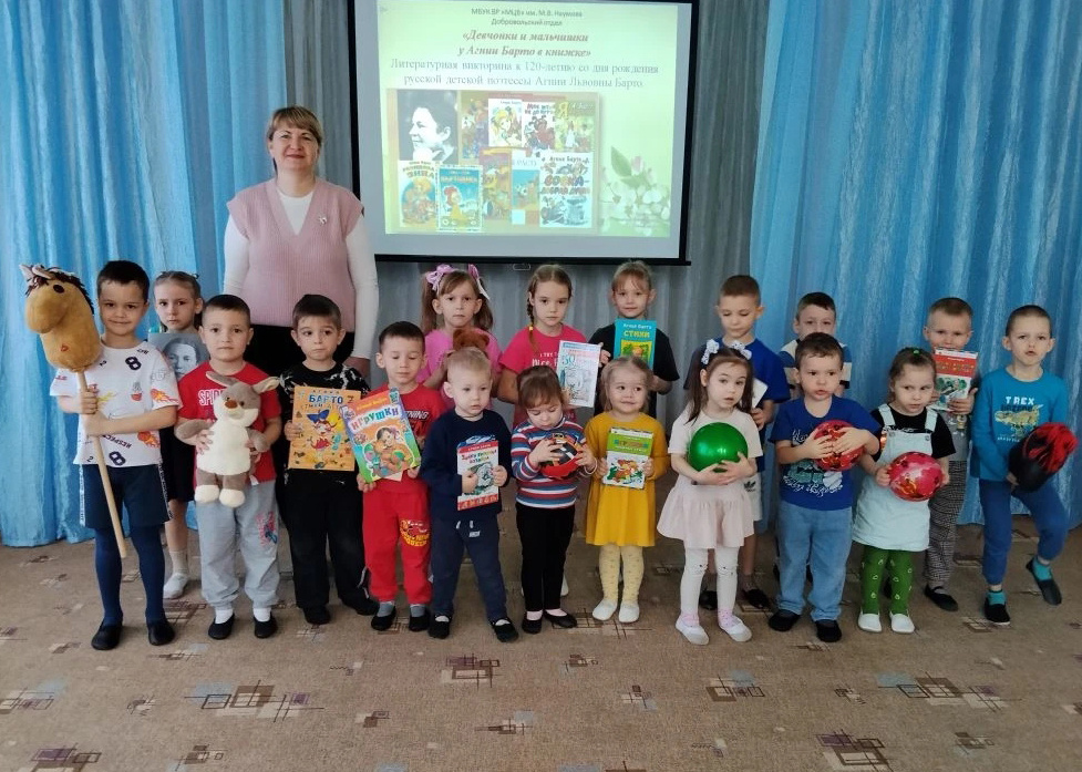 Её стихи живут с нами всегда: «Уронили мишку на пол…», «Зайку бросила хозяйка…», «Спать пора! Уснул бычок…». Стихи Агнии Львовны Барто — это страницы нашего детства. Именно на этих добрых, звонких строчках выросли мы, наши мамы и папы, дедушки и бабушки, а теперь растут и наши дети. Каждым своим стихотворением Агния Барто поднимает настроение читателя до высоты радости, помогает ему не просто насладиться веселой игрой слов, но и пробуждает в ребёнке доброту, желание самому творить радость для других. Книги Агнии Львовны Барто печатались миллионными тиражами, стихи писательницы стремительно вошли в нашу жизнь и укрепились где-то глубоко в подсознании, её рифмы стали по-настоящему народными, превратившись в пословицы и поговорки. Стихотворения Агнии Барто до сих пор любят читать взрослые и дети, ведь они такие весёлые, лёгкие и понятные. В рамках проекта «Чтение с увлечением» к 120-летию со дня рождения русской детской поэтессы А.Л. Барто Добровольский отдел провёл для воспитанников детс