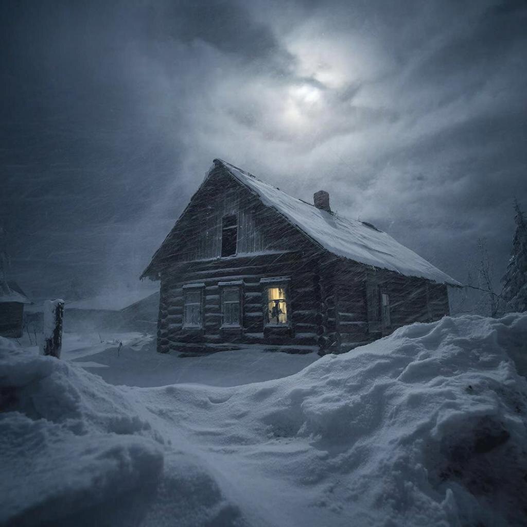 Утром метель утихла. Солнце, яркое и слепящее, заливало заснеженную деревню. Изба на отшибе стояла тихая, припорошенная, с чуть закопченной трубой, из которой не шел дым.