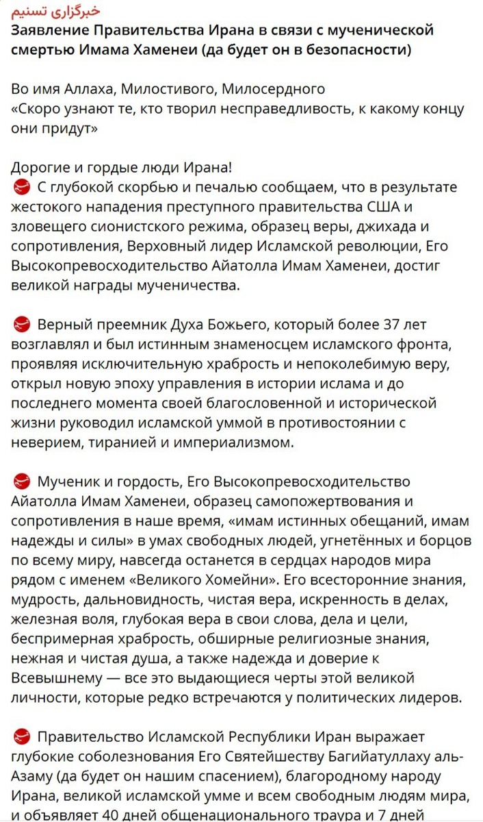 Вчера иранцы практически весь день опровергали гибель верховного лидера Али Хаменеи, но подтвердили лишь после заявления Трампа