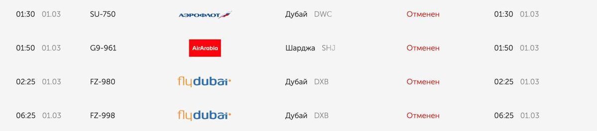 «Аэрофлот», FlyDubai и AirArabia выступили с заявлениями, что в сложившихся условиях пока не летят. «В связи с продлением временных ограничений на использование воздушного пространства ОАЭ Аэрофлот вынужденно отменяет рейсы в/из Дубая и Абу-Даби на 1 марта», - заявили в «Аэрофлоте». 790 пассажиров авиакомпании сейчас размещены в гостиницах ОАЭ. Тех, кто не может вылететь, еще больше, поскольку часть пассажиров от гостиничных номеров отказалась. Держатся лишь «Уральские авиалинии», которые утренний рейс в Дубай перенесли на 18:00, но окончательно ещё не отменили. @Квартал Миллионеров