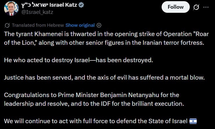 Israeli Defense Minister CONGRATULATES Netanyahu with 'THWARTING' of Iran's Supreme Leader