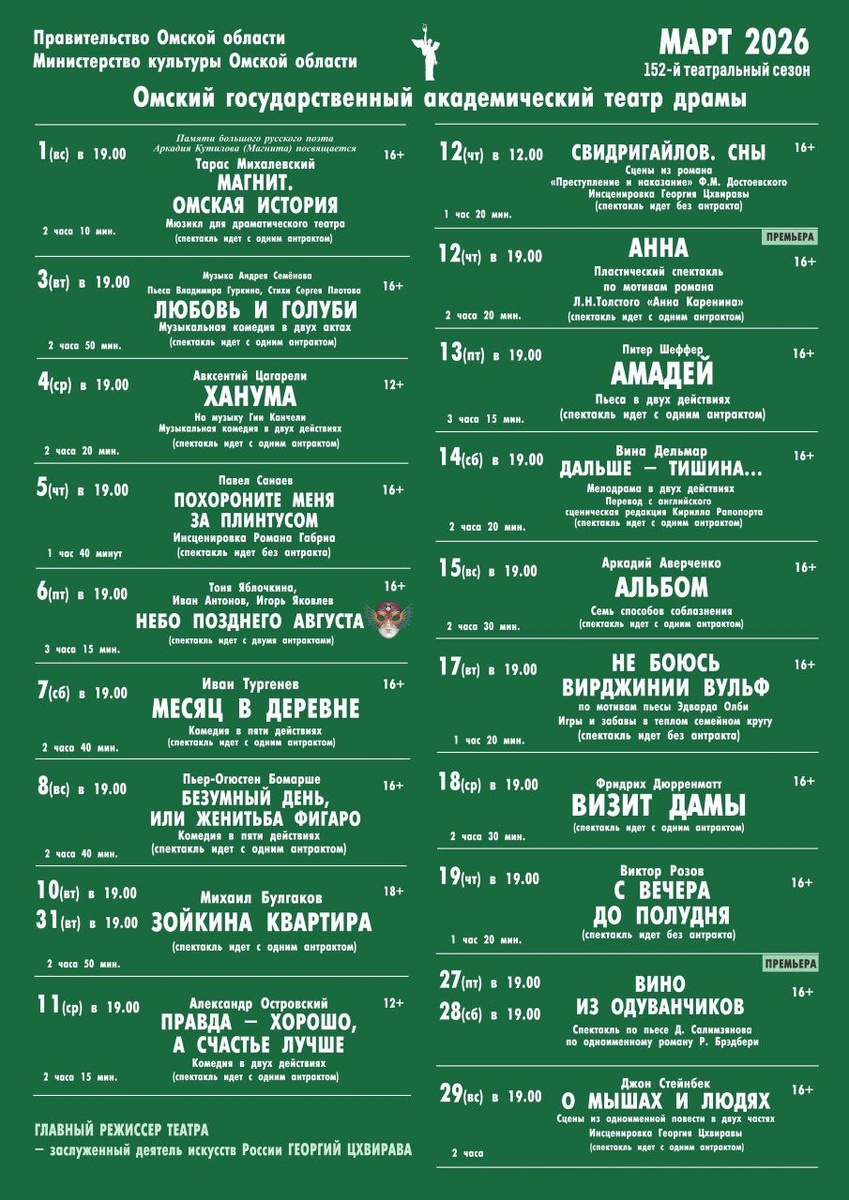! Поздравляем всех с первым днем весны! Пусть отступают морозы, и яркое солнышко радует нас своим теплом. Приглашаем вас на спектакли Омского академического театра драмы в марте! Сохраняйте себе репертуар, выбирайте спектакль на свой вкус и приходите в театр. Мы рады видеть вас каждый вечер! #ОмскКультурнаястолица2026