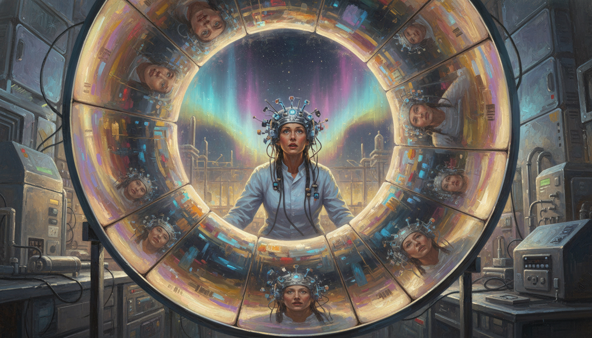 Он создал конструкцию из алюминиевых листов, отполированных до зеркального блеска и свёрнутых в спираль. Внутри — кресло. На голову испытуемого — шлем с датчиками. Никакой электроники, никакого питания. Только геометрия и металл.