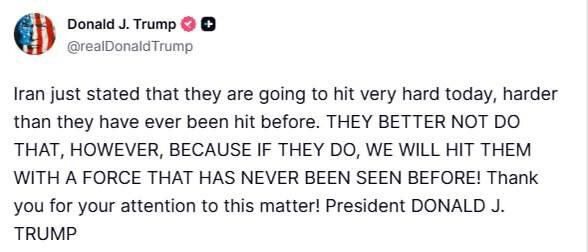 «Атакуем с невиданной ранее силой»: Трамп призвал Иран воздержаться от ударов возмездия