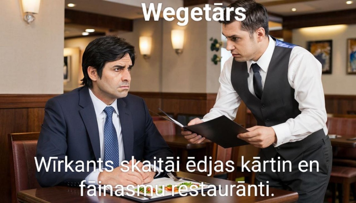 #prūsiskai_kōmiksai Wegetārs. Wīrkants skaitāi ēdjas kārtin en fāinasmu restaurānti. — Kaīls pergūbuns! — Kaīls! As turri prasīsenjan ezze ēdjas kārtin. As asma wegetārs. Ast stwi wegetāriska ēda? — Jā, mes turrimai spārts labban keptan wersjaīnan. — Wersjaīna ast mēnsa! As ni ēma mēnsan! — Ō, jā, etwinūjais men. Gertistjan ast gardu. — Gertistjan ast mēnsa. As ni ēma mēnsan! — Mes turrimai mišmašan... — Ō, as mīli mišmašan! Ka ast en mišmašu? — Stwen ast tōmati, salāts, zuks... — As ni ēma zukkan! As asma wegetārs! — Mes turrimai frittins... — Labbai. Frittis ast fāinas. — Frittis, izwanginewīngi. Be... Ambūkas anktasgeītin? — Sklāit mēnsan, madli! Вегетарианец Виркантс читает меню в крутом ресторане. — Добро пожаловать! — Привет! У меня вопрос по поводу меню. Я — вегетарианец. Здесь есть вегетарианская еда? — Да, у нас есть очень хорошая запечённая говядина. — Говядина — это мясо! Я не ем мясо! — О, да, прошу прощения. Цыплёнок вкусный. — Цыплёнок — это мясо. Я не ем мясо! ⬇️⬇