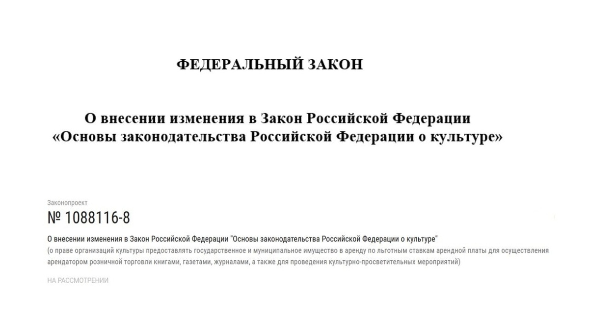 Государственная Дума в первом чтении приняла резонансный законопроект, который может стать одной из самых заметных мер поддержки книжной отрасли за последние годы. Речь идет о поправках в закон «Основы законодательства РФ о культуре», дающих учреждениям культуры право сдавать свои площади под книжную торговлю и просветительские мероприятия по льготной ставке аренды. Суть закона Если документ будет окончательно принят, под действие новых правил попадут почти 90 тысяч российских учреждений культуры (ДК, музеев, театров, музыкальных школ), значительная часть из них располагает свободными или неэффективно используемыми площадями. Теперь у них появится законное право сдавать свои помещения в аренду по льготным ставкам. Но не всем подряд, а только тем, кто будет торговать книгами, газетами и журналами, а также проводить «культурно-просветительские мероприятия». Размер льготной ставки для федерального имущества будет утверждаться решением Правительства РФ, а для регионального и муниципальног
