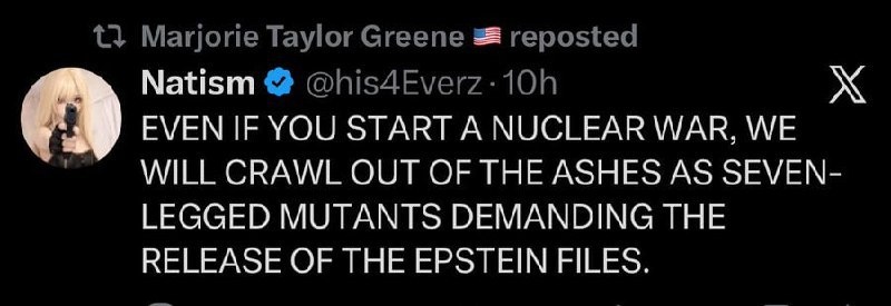 : «Даже если вы начнете ядерную войну, мы выползем из пепла в виде семиногих мутантов, требуя обнародования файлов Эпштейна». Сальное Дифлопэ