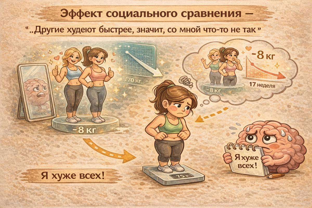Вышло уже 2 статьи о когнитивных ловушках: Продолжаем эту тему и наконец-то определимся с путем обхода всех этих ловушек. Мы живём в эпоху соцсетей, где каждый день видим «идеальные» трансформации: минус 20 кг за два месяца, плоские животы, фотографии «до и после». Мозг автоматически сравнивает наш прогресс с чужим - и делает вывод, что мы слишком медленные, слишком слабые, слишком толстые. «Моя подруга похудела на 10 кг за месяц, а я только на 3. Наверное, мне это не дано.» Правда в том, что каждое тело уникально. Скорость похудения зависит от генетики, гормонального фона, возраста, уровня стресса и десятков других факторов. Сравнивать себя с другими - значит сравнивать апельсин с яблоком. Магическое мышление - это вера в волшебное решение, которое мгновенно избавит от лишнего веса без усилий. Детокс-чаи, жиросжигающие таблетки, «секретная диета звёзд» - всё это обещает чудо. И мозг с радостью в это верит, потому что это проще, чем менять привычки. «Если я начну пить этот жиросжиг