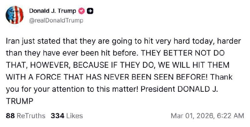🇺🇸🇮🇷⚡️ - "Иран только что заявил, что они собираются нанести очень сильный удар сегодня, сильнее, чем когда-либо прежде. ОДНАКО ЛУЧШЕ БЫ ИМ НЕ ДЕЛАЛИ ЭТОГО, ПОТОМУ ЧТО ЕСЛИ ОНИ ЭТО СДЕЛАЮТ, МЫ УДАРИМ ПО НИМ СИЛОЙ, КОТОРУЮ ЕЩЁ НИКТО НИКОГДА НЕ ВИДЕЛ! Спасибо за ваше внимание к этому вопросу! Президент ДОНАЛЬД Дж. ТРАМП" - Президент Трамп через Truth Social. 💬"Iran has just stated that they are going to strike very hard today, harder than ever before. HOWEVER, IT WOULD BE BETTER FOR THEM NOT TO DO THIS, BECAUSE IF THEY DO, WE WILL HIT THEM WITH A FORCE THAT NO ONE HAS EVER SEEN BEFORE! Thank you for your attention to this issue! President DONALD J. TRUMP" - President Trump via Truth Social.