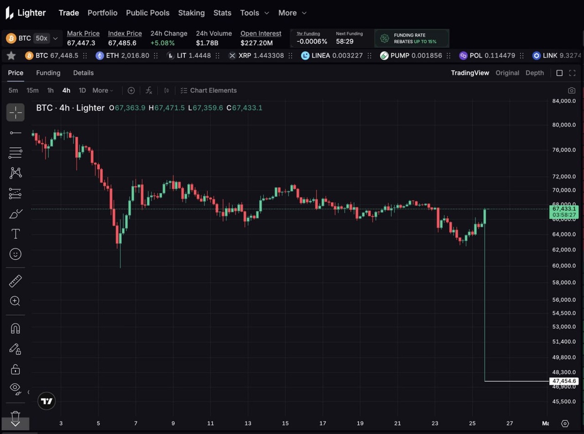 ? ΠΠ° Π³ΡΠ°ΡΠΈΠΊΠ΅ ΠΏΠ»Π°ΡΡΠΎΡΠΌΡ Lighter ΡΠ΅Π½Π° BTC ΠΎΠΏΡΡΠΊΠ°Π»Π°ΡΡ Π΄ΠΎ $47k. βοΈ ΠΠ° ΡΠ°ΠΌΠΎΠΌ Π΄Π΅Π»Π΅, Π½ΠΈΡΠ΅Π³ΠΎ ΡΠ΅ΡΡΡΠ·Π½ΠΎΠ³ΠΎ Π½Π΅ ΠΏΡΠΎΠΈΠ·ΠΎΡΠ»ΠΎ. ΠΡΡΠΏΠ½ΡΠΉ ΠΈΠ³ΡΠΎΠΊ ΡΠ°Π·ΠΌΠ΅ΡΡΠΈΠ» ΠΎΡΠ΄Π΅Ρ Π½Π° 1000 BTC, ΡΡΠΎ Π²ΡΠ·Π²Π°Π»ΠΎ ΠΏΡΠΎΠ±ΠΎΠΉ Π²ΡΠ΅Ρ