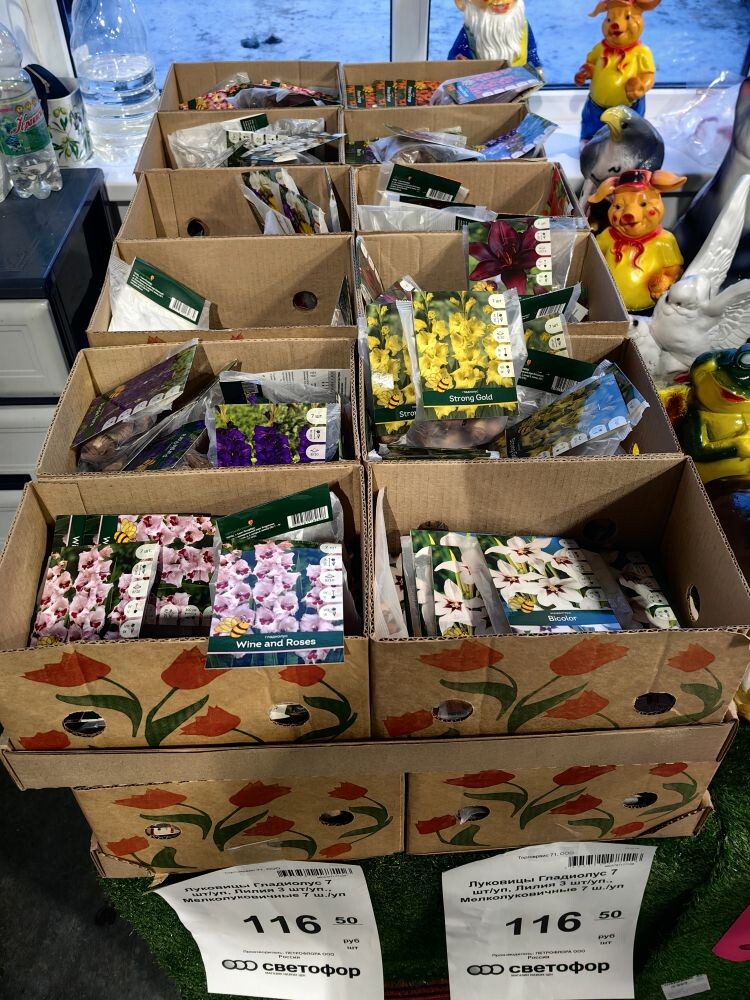 Прямо на входе коробки с луковичными. Сорта миленькие, всё живое. В ассортименте гладиолусы, фрезия микс, лилии и ацидантера. Стоимость 116,50р за упаковку. Гладиолусов довольно много. Выбрать можно. Луковки небольшие. Но я такое брала многократно, хорошие вырастают цветочки. Последние пару лет не выращиваю гладиолусы, все луковицы пропали. И пока не хочу к ним возвращаться, хотя они мне очень нравятся.