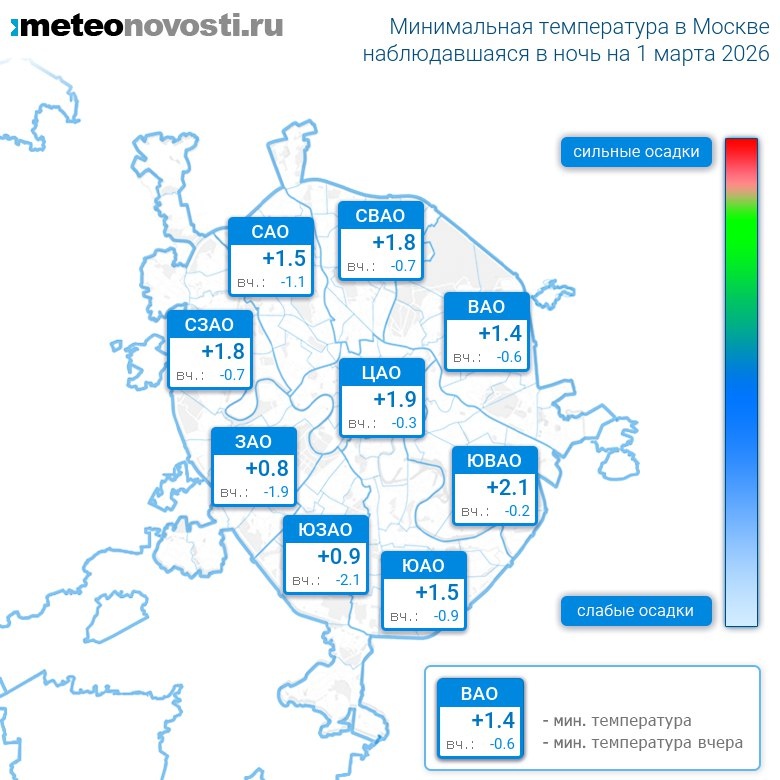 Минимальная температура ночью в Москве оказалась на 7.4°C выше нормы, что значительно теплее, чем обычно. Самая низкая температура +0.8°C была зафиксирована в 22 часа на западе города, а теплее всего было на юго-востоке: +2.9°C. Разница по минимальной температуре в разных частях столицы составила за минувшую ночь 2.1°C. Максимальные порывы ветра ночью достигали 4 м/с. Атмосферное давление за ночь не изменилось и составило 751 мм.рт.ст. Осадков не наблюдалось. Самая холодная ночь в Москве 1 марта наблюдалась в 1881 году, когда минимальная температура составила -30.0°C, а самая теплая в 2017 году с температурой +2.6°C. Перейти на сайт Прогноз погоды на 14 дней