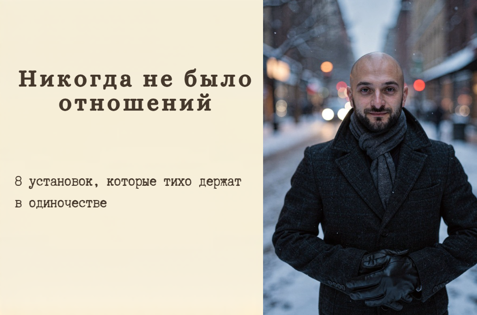 Если вам 35+, а за плечами — не развод, не токсик бывший, не три тома переписки «почему ты мне больше не пишешь», а вообще… ничего — то общество уже слегка нервничает. Мама, подруги, даже соседка с пятого этажа как-то подозрительно смотрит. Рано или поздно ты сама начинаешь думать: «Может, со мной реально что-то не так?» Не обязательно, но есть штука похитрее. Это установки. Те самые, которые тихо сидят в голове и шепчут: «Да не лезь ты туда». Я сейчас их перечислю. А вы там сами… узнаете или нет. Вот когда похудею. Когда заработаю. Когда проработаю все травмы. Когда стану спокойной, мудрой и сияющей. Короче говоря — никогда. Мы относимся к отношениям как к выпускному экзамену. Типа: «Пока не готов — в зал не входить». А отношения — это не сцена Большого театра. Это тренажёрка. Туда как раз приходят качаться, а не с кубиками. Обожаю этот аргумент. Он звучит умно, но по сути — это оправдание даже не пробовать. Во-первых, люди разводятся. Во-вторых, переезжают. В-третьих, просто поздно с