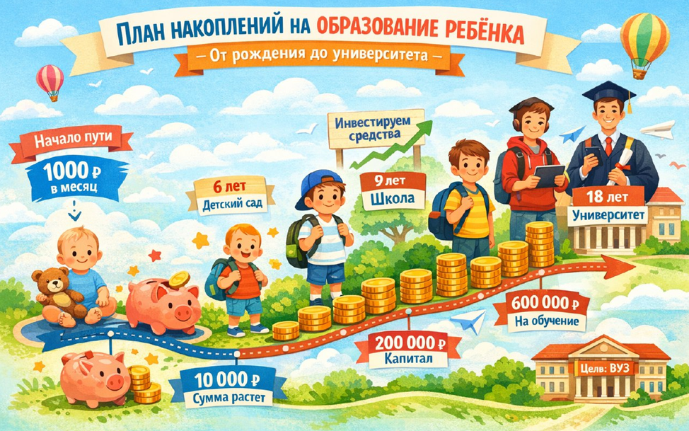 🔥 *Многие думают, что копить на образование нужно с 10-го класса. На самом деле — с первого. Я посчитал: если начать сегодня и откладывать по 1000₽ в месяц, к 18 годам будет 3 млн. Хватит на любой вуз. Сохраняйте — пригодится.* Сейчас: Через 18 лет (с учётом инфляции 8–12% в год): ✅ ИТОГО за 4 года бакалавриата: 8–12 млн ₽ Сложный процент + инвестиции + налоговые вычеты: Вывод: даже небольшие регулярные суммы превращаются в капитал . Для тех, кто хочет гарантию и не смотрит на графики Так же вычет до 52 000 рублей. ✅ Итог за 18 лет: ~3,2 млн ₽
