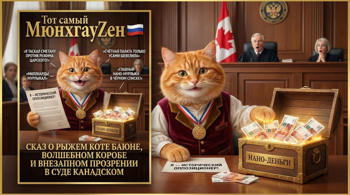 🚨 Сказ о Коте Баюне, волшебном коробе и внезапном прозрении в суде канадском В некотором царстве, в некотором государстве, а точнее — в Российской империи, ещё до великих потрясений, жил-был рыжий Кот. Да не простой Кот, а Баюн — хитрый, усатый, с голосом сладким, что мёд липовый. И приставлен тот Кот был к делам денежным да к нанотехнологиям, коими думал всю страну осчастливить. Сидел он в высоком тереме, сказки сказывал про светлое будущее, а сам знай себе лапкой водил — то туда, то сюда. 🔮 Завязка: Как Кот Баюн миллиарды мурлыкал И дали Коту Баюну государственный короб — ни много ни мало, а четыреста миллиардов рублей с хвостиком. "На, — говорят, — развивай нанотехнологии, чтоб Россия впереди планеты всей была". И начал Кот трудиться не покладая лап. Такие чудеса творил — закачаешься! Деньги таяли, как сметана на горячем языке, а нанотехнологии всё не появлялись. Зато появлялись норки заморские: на Кипре, в Швейцарии да в Италии. А сам Кот ходил важный, в бархатном жилете, с ме