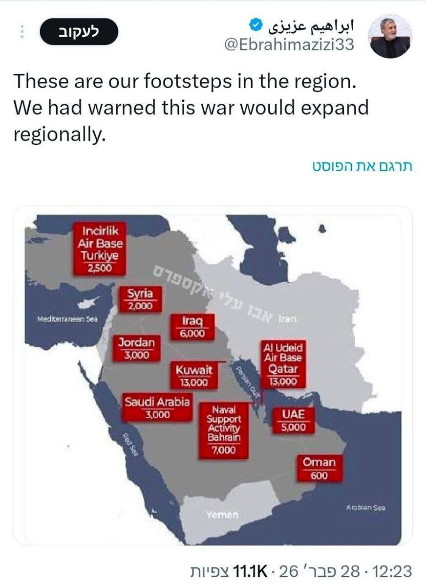 Глава Комитета национальной безопасности в Иране опубликовал карту американских баз в регионе с подписью — "Мы предупреждали, что эта война распространится на весь регион".