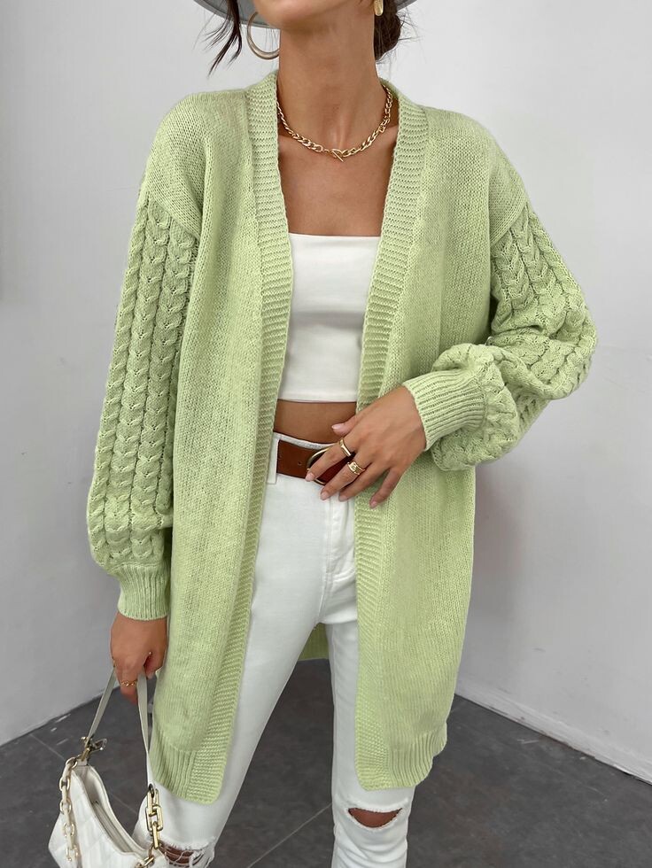 Добрый день, дорогие рукодельницы! Сегодня мы с вами вдохновимся вязанием кардиганов. Надеюсь, эта подборка придется вам по душе, и вы захотите создать что-то уникальное своими руками! Постараюсь ко всем моделям составить схемы узоров. Модели разнообразные, некоторые можно носить как блузы. Так что вы точно найдете что-то на свой вкус. Также не стесняйтесь делиться своими идеями и пожеланиями для следующей подборки в комментариях. С нетерпением жду ваших откликов! Буду очень благодарна, если вы подпишитесь на все мои соц сети: Вконтакте ссылка Телеграмм ссылка Одноклассники ссылка Ютуб ссылка Второй дзен канал ссылка Рутуб ссылка Мах ссылка Этот удлиненный кардиган со спущенным плечом выполнен лицевой гладью, придающей ему элегантный и стильный внешний вид. Особенностью модели являются рукава, украшенные простым узором в виде жгутов. Такой дизайн обеспечивает комфорт и оригинальность, делая кардиган универсальным элементом вашего гардероба. Раппорт: 9 петель и 6 рядов. Кардиган удлин