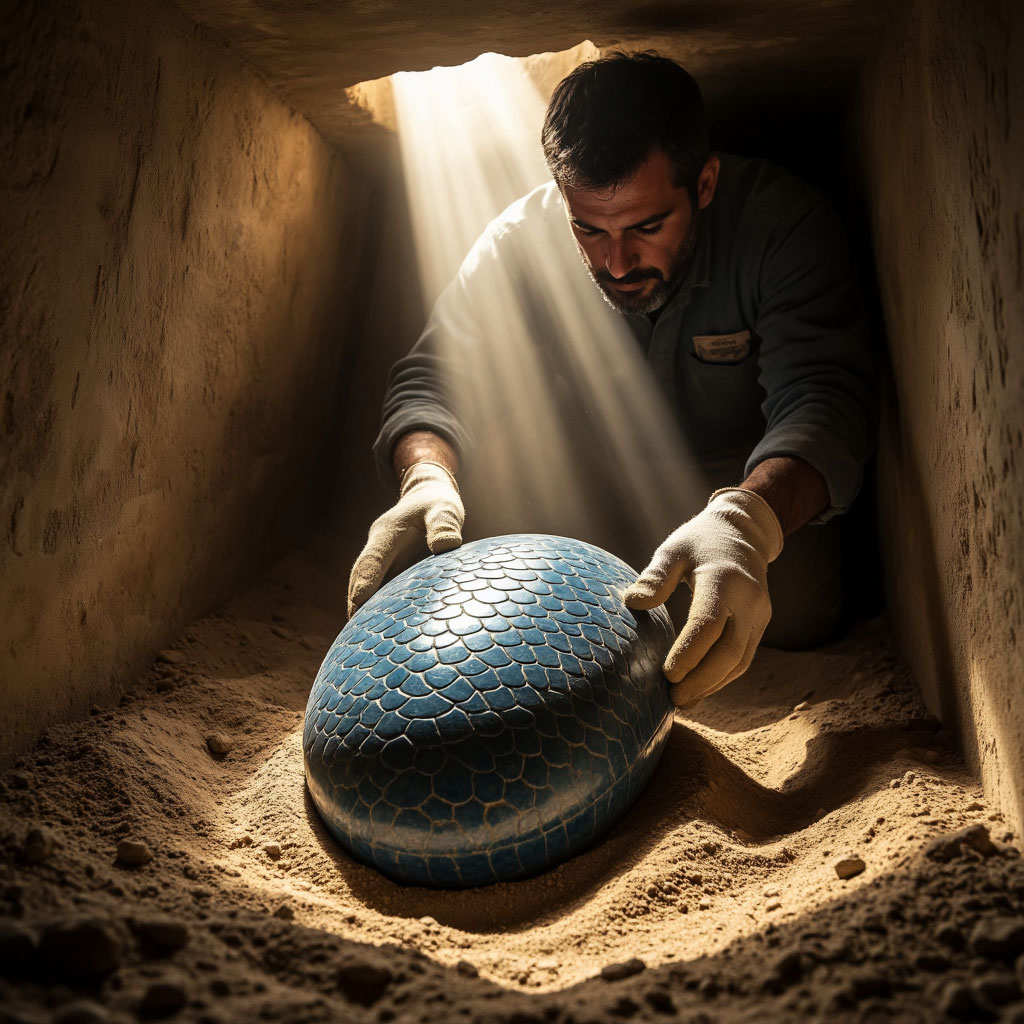 В далёком 1973 году британский археолог Ричард Торнтон отправился в экспедицию в Египет — к подножию плато Гизы. Его интересовали не пирамиды, а небольшие захоронения и древние шахты, которые, по слухам, могли хранить следы забытых культов. Торнтон слыл человеком осторожным, но одержимым: он верил, что древние цивилизации контактировали с чем‑то, что современная наука отказывалась признавать. Раскопки шли тяжело. Песок засыпал траншеи быстрее, чем их успевали углублять, а местные рабочие всё чаще перешёптывались о «духах пустыни», которые не любят, когда тревожат старые места. Но однажды утром один из рабочих, Махмуд, позвал Торнтона к раскопу: из стены шахты торчал странный предмет — не камень и не металл, а нечто гладкое, тёмно‑синее, с едва заметной текстурой, напоминающей чешую. Торнтон осторожно очистил находку. Это была капсула размером с кулак, овальная, без швов и креплений. На одной стороне виднелся небольшой выступ, похожий на кнопку. Археолог колебался несколько минут, затем