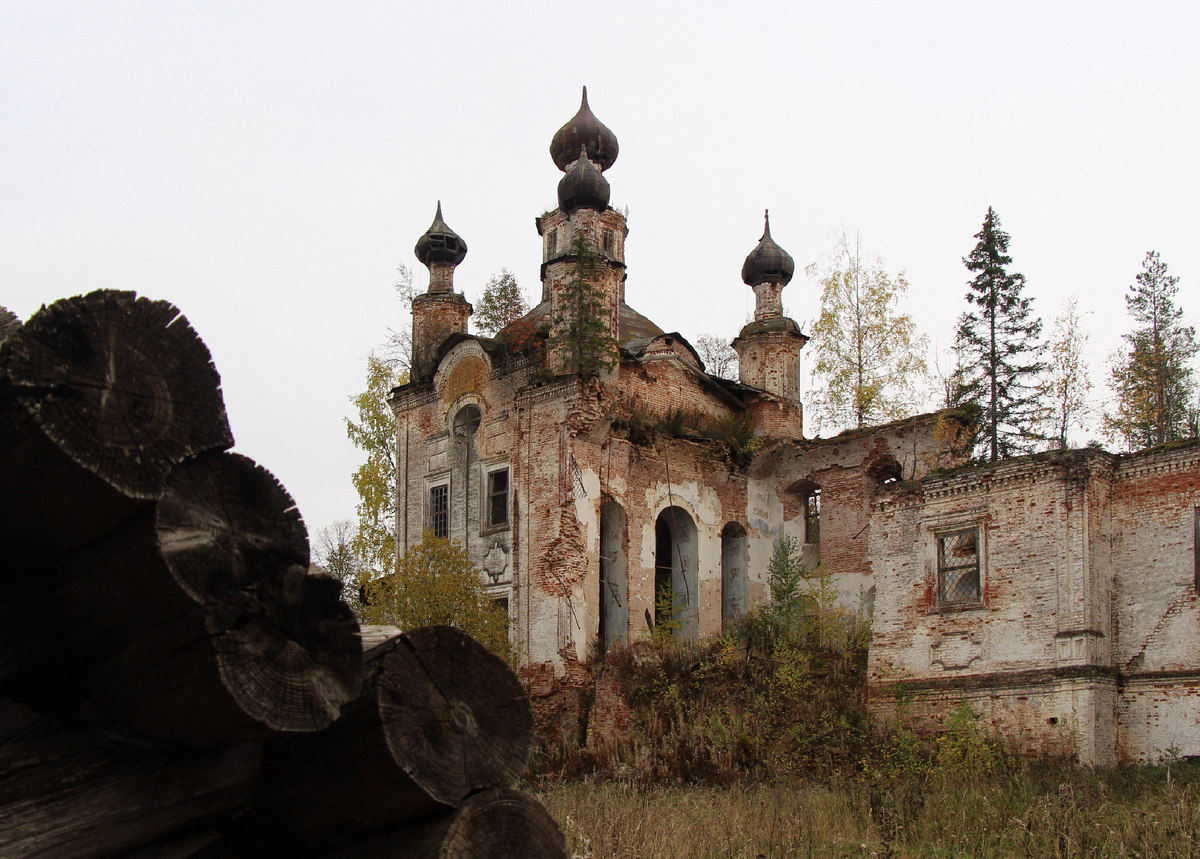 Хорошо виднеющаяся тропа (!) по рухнувшим кирпичам приведет Вас на второй этаж. Оттуда, если можно так выразиться, потрясающий вид! Стоя между возле трех арок, взгляд упирается в разрушенную стену трапезной и в грозно высящуюся колокольню. Расхлебяненная набекрень дверь второго этажа, которую приходится рассматривать сквозь разросшиеся молодые деревца, как ничто другое показывает разруху. Насколько величественным выглядит этот храм на старых фотографиях! Меня правда удивляли его габариты, пока я находилась внутри. Этот поистине огромное сооружение, рассчитанное на большое приход. Что подтвердилось- в разное время девятнадцатого века к Покровской церкви относились до сорока близлежащих деревень.