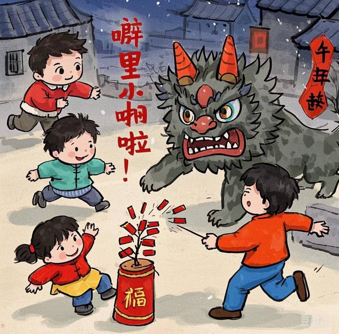 Одна из самых известных историй в культуре Китай связана с чудовищем по имени Нянь (年 nián). По преданию, в древние времена в горах жил страшный зверь Нянь. Целый год он скрывался в пещере, а в канун Нового года спускался в деревни. Люди боялись его: он разрушал дома, портил запасы еды и пугал жителей. Поэтому каждый год перед праздником семьи уходили из деревни в горы, чтобы спрятаться. Однажды в одну из деревень пришёл старик. Он попросил приюта на ночь, но жители, собираясь бежать, только отмахивались: «Скоро придёт Нянь — нужно спасаться!» Старик улыбнулся и сказал, что знает, как справиться с чудовищем. Когда наступила ночь, вместо пустых тёмных улиц Нянь увидел дома, украшенные красной тканью. На дверях висели алые свитки, во дворе горел яркий огонь, а вокруг раздавались громкие хлопки бамбука (прообраз фейерверков). Чудовище остановилось. Оно испугалось яркого красного цвета и треска огня. Заревев, Нянь убежал обратно в горы — и больше не возвращался. Наутро жители увидели,