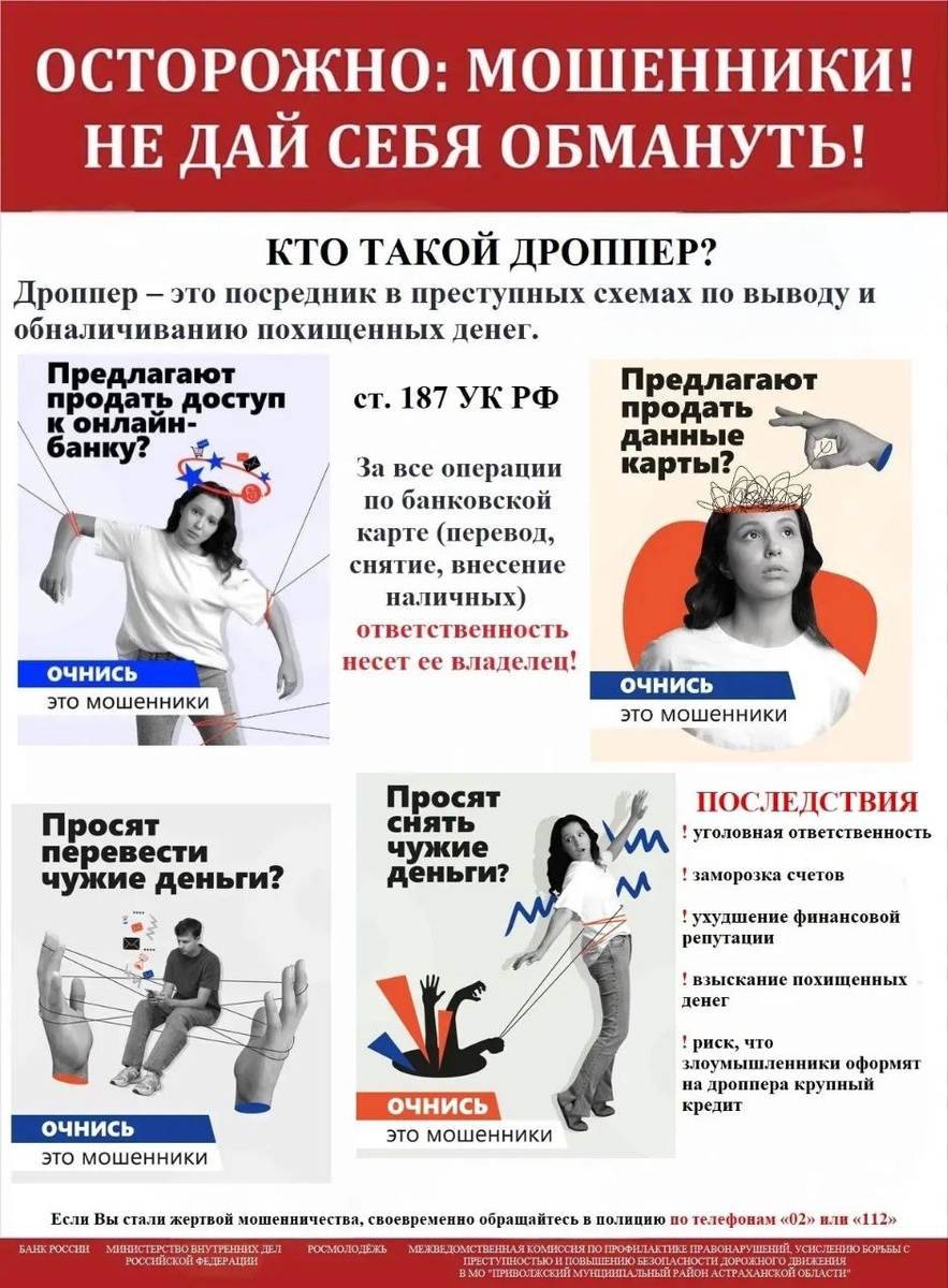". Дропперская деятельность - это использование подставных лиц для вывода и обналичивания незаконно полученных средств. Задачей кампании является научить людей распознавать мошенников, рассказать о наиболее распространенных преступных схемах. Среди наиболее распространенных способов совершения преступлений остаются онлайн покупки, звонки о несанкционированном списании денежных средств или оформление кредита, инвестирование, взлом друга или знакомого в мессенджерах или социальных сетях. Будьте бдительны☝️ #Приволжскийрайон