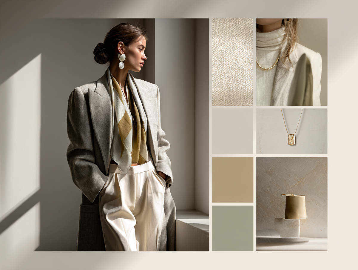 Шалфейный — это зелёный, который повзрослел. Он больше не пытается быть ярким. Он просто есть. И этого достаточно. В сочетании с серебром этот цвет создаёт образ, который выглядит одновременно современно и вне времени. Это особенно заметно в аксессуарах: серьгах, кольцах, текстурированных украшениях.Сочетание №1. Молочный и песочный