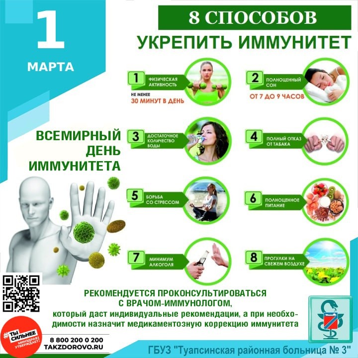 ➡️ употребляйте продукты, богатые витаминами; ➡️ пейте чистую воду; ➡️ старайтесь больше времени проводить на природе; ➡️ поддерживайте хорошую физическую форму: делайте утреннюю зарядку или пробежку; ➡️ постарайтесь избавиться от вредных привычек; ➡️ вовремя проходите вакцинацию; ➡️ избегайте стрессов, разрушительного действия таких психологических качеств как злость, ревность, зависть, агрессия. ‼️ Проявлениями нарушений в работе иммунной системы служат частые простудные заболевания, частые головные боли, боли в суставах и мышцах, нарушения сна, увеличенные лимфоузлы. ⚠️ Для поддержания иммунитета рекомендуется проконсультироваться с врачом-иммунологом, который даст индивидуальные рекомендации, а при необходимости, после соответствующих клинических и лабораторных наблюдений с учетом особенностей течения заболеваний, назначит медикаментозную коррекцию иммунитета. 👉 Подробнее на нашем сайте: https://hosp23.ru/medevents/425.html #укреплениеобщественногоздоровья