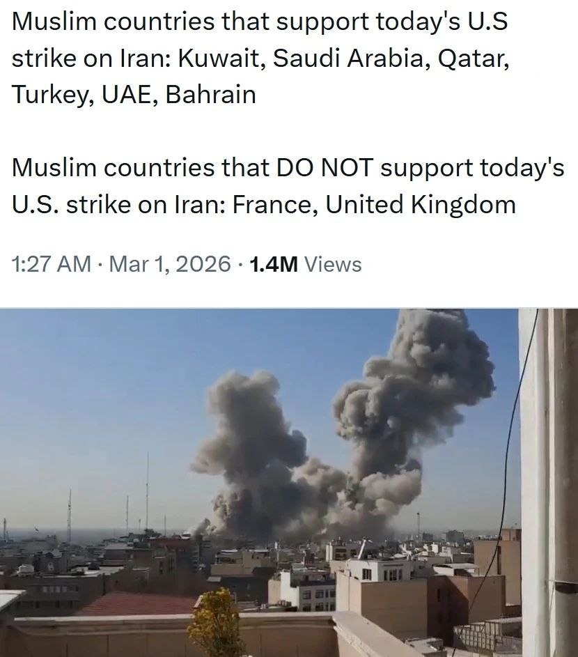 Вот что известно на эту минуту. Мусульманские страны, поддержавшие бомбежки США – Кувейт, Саудовская Аравия, Катар, Турция, ОАЭ и Бахрейн. Мусульманские страны, которые дистанцировались от этих бомбежек – Франция и Великобритания (а также йеменские хуситы и ливанская группировка «Хезболла»). Грядёт что-то очень страшное