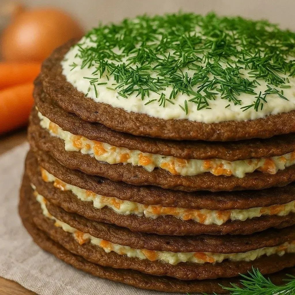» Мой любимый печёночный торт! Многие морщатся от одного слова «печень»... Но это только потому, что они ни разу не пробовали ЭТО чудо! 😍 Для блинчиков: • 1 кг куриной печени • 2 ст.л. сметаны • 250 г муки (просеянной) • 2 яйца • 1 ст.л. соли • Немного сливочного масла для жарки Прослойка: • 3 луковицы • 4 моркови • 1 ст.л. соли Соус для смазывания: • 100 г сметаны • 100 г майонеза • 2 ст.л. прованских трав • 5 зубчиков чеснока Приготовление: 1. Печень промываем, добавляем все ингредиенты для теста и пробиваем блендером до однородности. 2. Жарим печёночные блинчики на сковороде, смазанной сливочным маслом. 3. Лук мелко шинкуем, морковь натираем и обжариваем до мягкости. 4. Для соуса смешиваем сметану, майонез, травы и чеснок. 5. Собираем торт: блин → соус → овощная начинка → снова блин и так до верха. 6. Верх смазываем кремом и украшаем зеленью. Оставляем в холодильнике, чтобы торт пропитался, и подаём охлаждённым. Понравился рецепт?