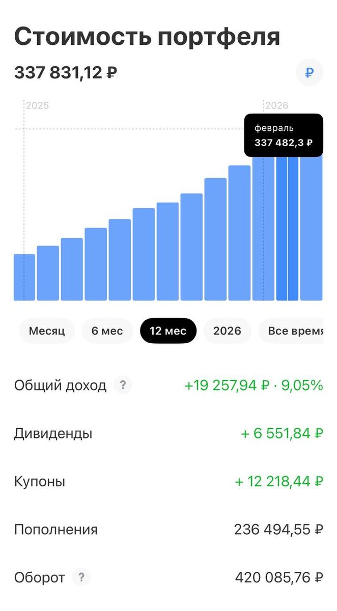 ‼️ Портфель вырос до 337 482,30р (+12,18%) 1. #иис за месяц Получены #купоны на #облигации : 💰 $RU001A10DBV6 - 16,44р 💰 $RU000A10DCK7 - 32,06р 💰 $RU000A10CZB9 - 34,52р 💰 $RU000A10DQ68 - 14,18р 💰 $RU000A10C8F3 - 247,38р 💰 $RU000A1077X0 - 173,58р 💰 $RU000A10CB66 - 38,64р 💰 $RU000A10CC32 - 27,94р 💰 $SU26240RMFS0 - 593,30р 💰 $RU000A10DTF1 - 29,58р 💰 $RU000A108G70 - 239,42р 💰 $RU000A106A86 - 31,66р 💰 $SIBN6P2 - 68,22р 💰 $RU000A10DZK8 - 47,97р 💰 $RU000A10AAQ4 - 139,60р Общая стоимость 175 403,75р (+11,83%) Купоны за месяц - 1 734,39р - 1,11% 2. Брокерский счёт за месяц Общая стоимость 162 078,55р (+12,55%) #рейтинг по стоимости: ✅ $PLZL +38,52% ✅ $GMKN +26,48% ✅ $TRNFP +21,68% #антирейтинг по стоимости: 🚫 $ASTR -18,56% 🚫 $LKOH -11,11% 🚫 $X5 -10,37% #прояви_себя_в_пульсе